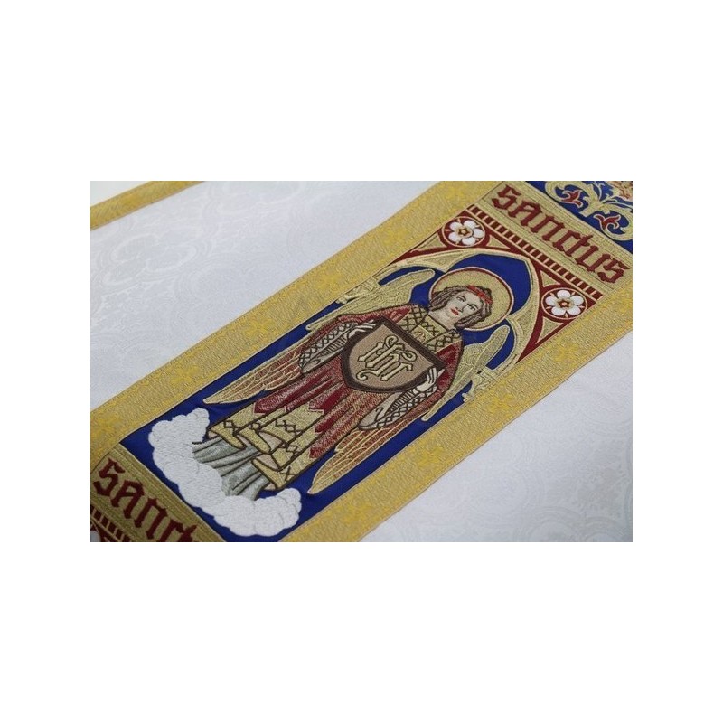 Acompanha uma estola, manípulo, bolsa corporal e véu de cálice.