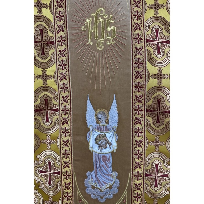 Acompanha uma estola, manipulo, bolsa corporal e véu de cálice.