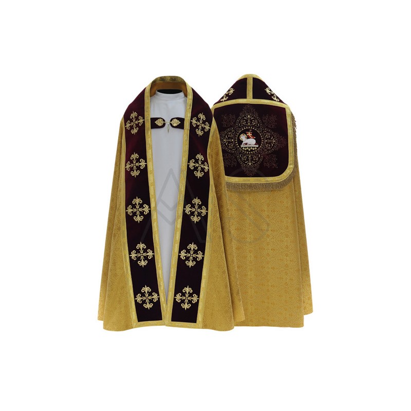 O capuz e o galão é em tecido de veludo com acabamento em fita dourada.