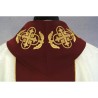O bordado é igual na frente e nas costas com fio metalizado dourado.