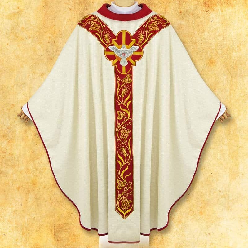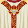 A casula semigótica é bordada em alto relevo com a imagem do Espirito Santo de altíssima qualidade.