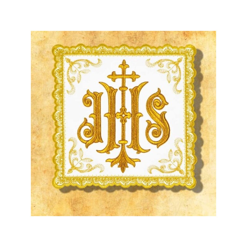 O bordado tem a imagem das letras JHS.
