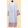 Túnica bordada com renda nas mangas e na barra, pode ser feita em forma de alva (acabamento igual sobrepeliz).