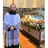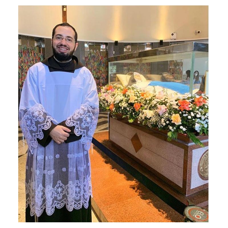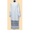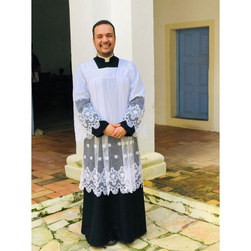 Túnica bordada com renda italiana nas mangas e na barra, pode ser feita em forma de alva (acabamento igual sobrepeliz).