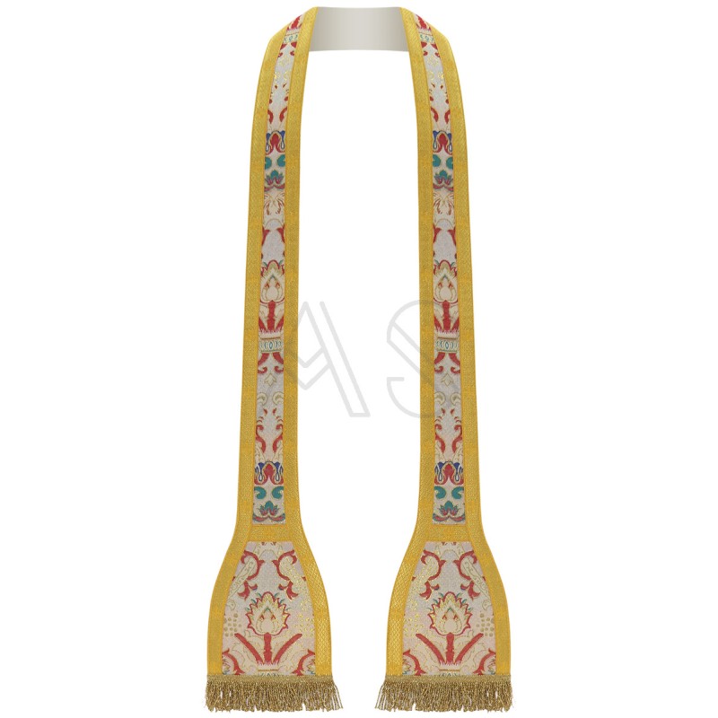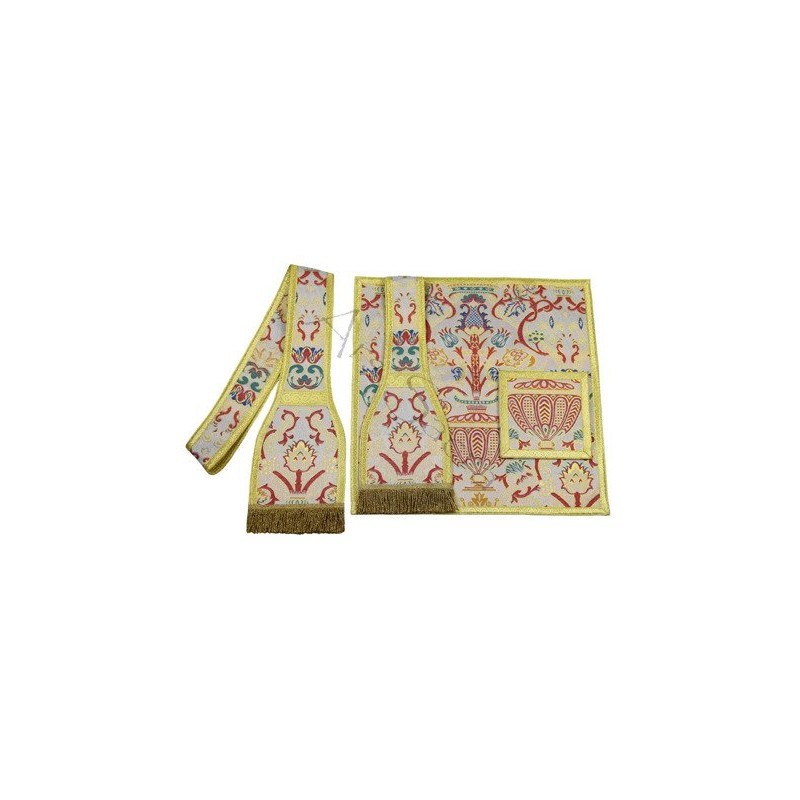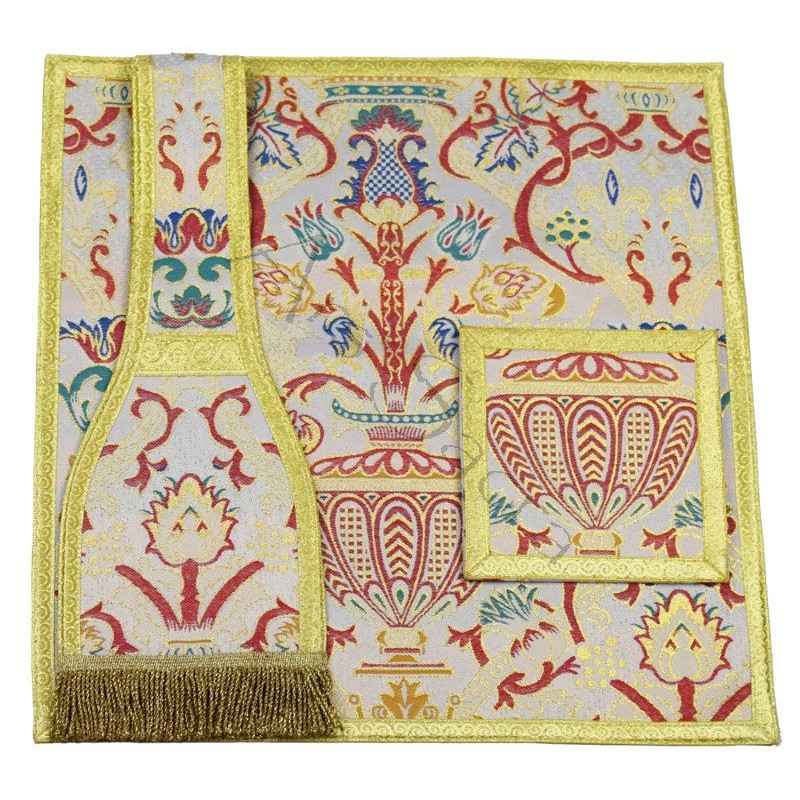 Acompanha uma estola, manípulo, bolsa corporal e véu de cálice.