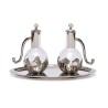 Bandeja e decorações feitas de latão na cor prata. As alças e plugues das galhetas são feitas de metal na cor prata.