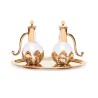 Bandeja e decorações feitas de latão na cor dourada. As alças e plugues das galhetas são feitas de metal na cor dourado.