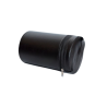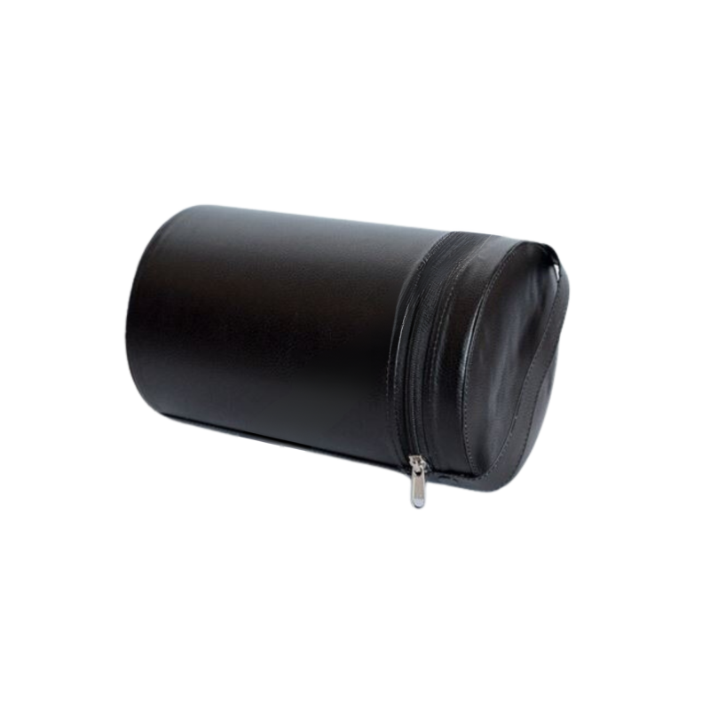 Estojo fechado com zíper, feito de madeira e couro ecológico preto.