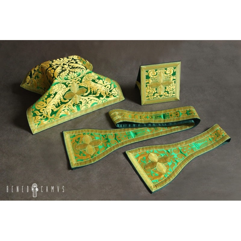 Essa casula acompanha uma estola, manípulo, bolsa corporal e véu de cálice.