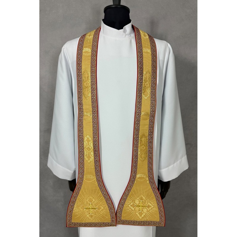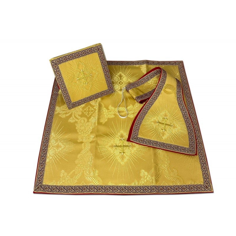 O conjunto inclui: bolsa corporal, manipulo e véu para cálice.