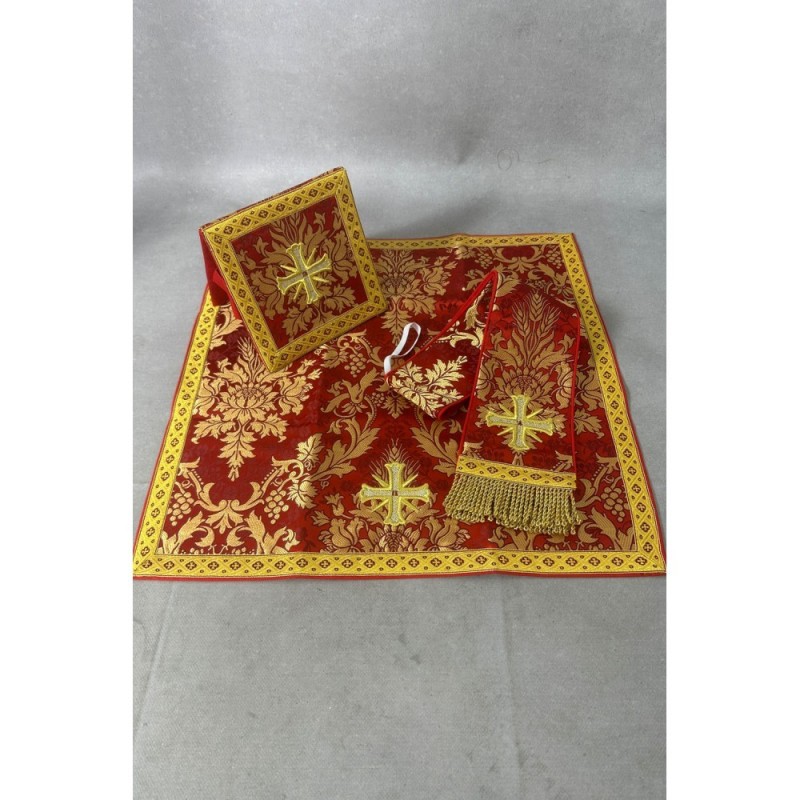 Casula semigótica com acompanhamento de manípulo, bolsa corporal e véu de cálice bordado de altíssima qualidade.