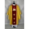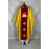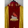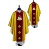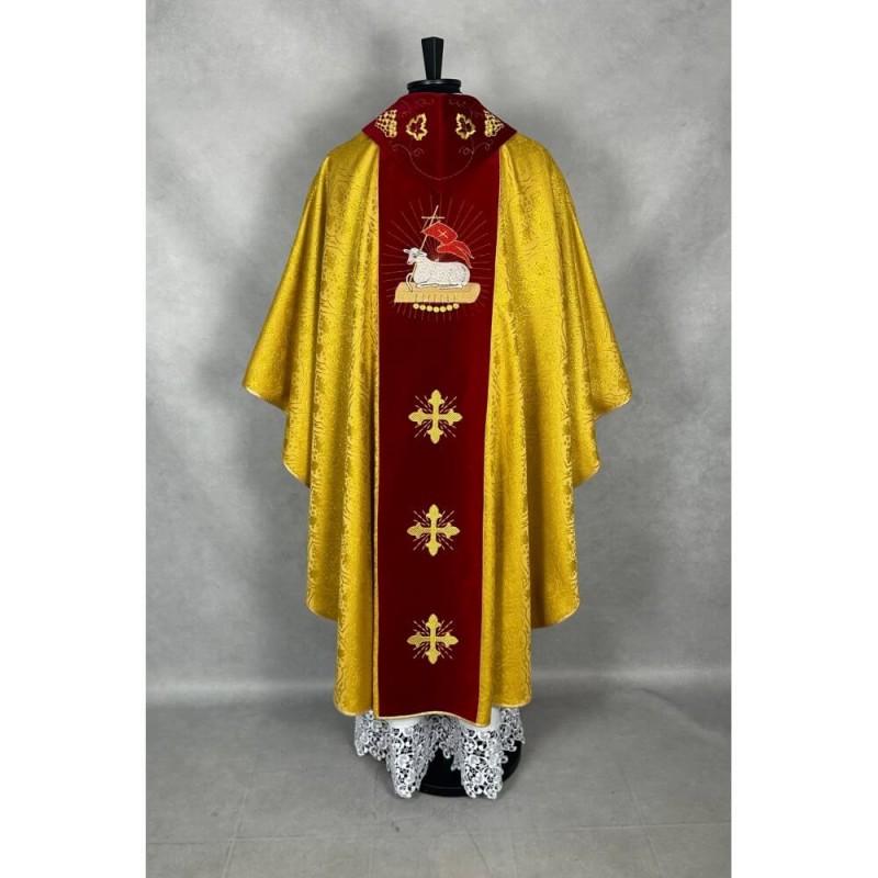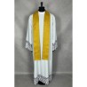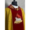 O bordado é igual na frente e nas costas com fio metalizado dourado.