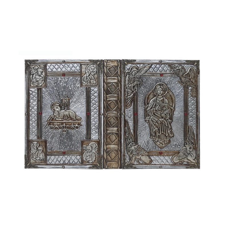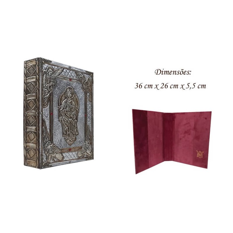 Capa com imagem Excelsis Deo Gold. Feito em Alumínio, com alto relevo. Pintura em tom de bronze. Interior forrado com veludo.