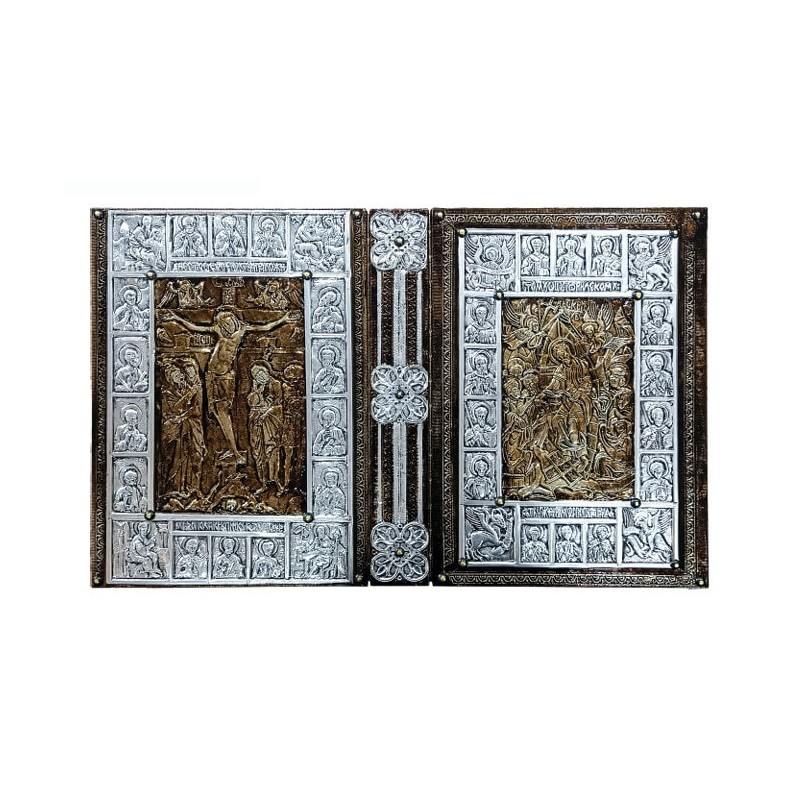 Capa com imagem Grega Ortodoxa. Feito em Alumínio, com alto relevo. Pintura em tom de bronze. Interior forrado com veludo.
