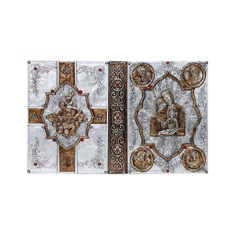 Capa com imagem Sagrada Família Silver. Feito em Alumínio, com alto relevo. Pintura em tom de bronze. Interior forrado com veludo.