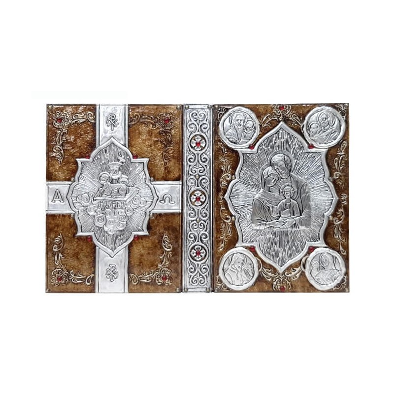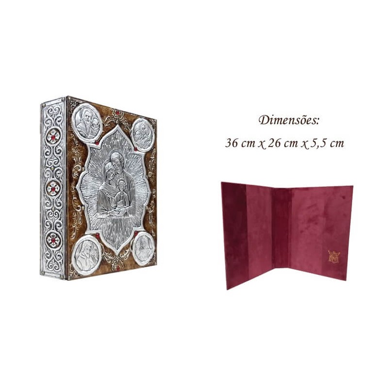 Capa com imagem Sagrada Família Gold. Feito em Alumínio, com alto relevo. Pintura em tom de bronze. Interior forrado com veludo.