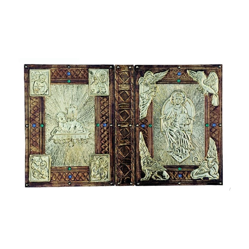 Capa com imagem Excelsis Deo Dourado. Feito em Alumínio, com alto relevo. Pintura em tom de bronze. Interior forrado com veludo.