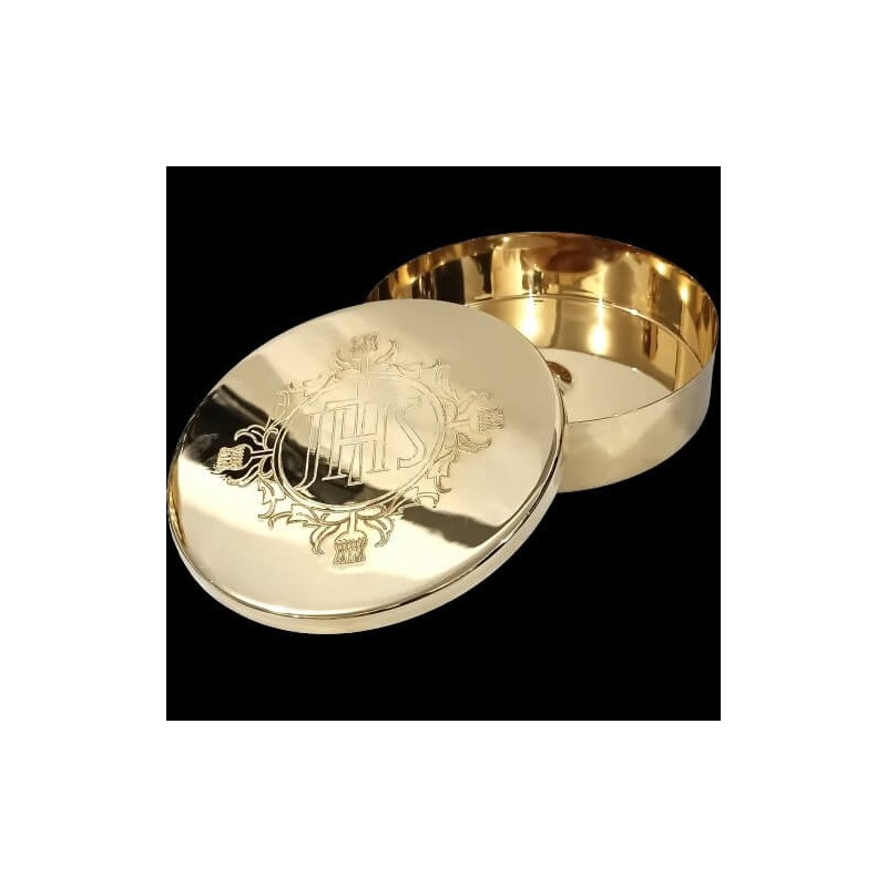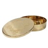 Teca em metal, com banho de ouro 24k e uma cruz e JHS gravados na tampa.