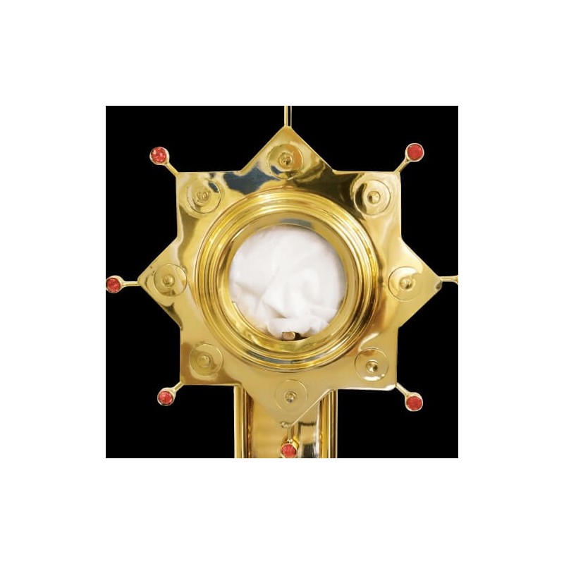 Ostensório feito em latão a banho dourado com verniz e com apliques em níquel.