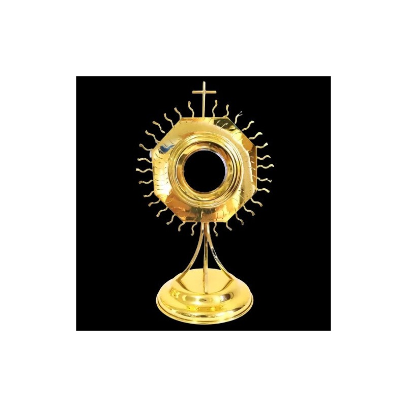 Ostensório feito em latão a banho dourado com verniz e com apliques em níquel.