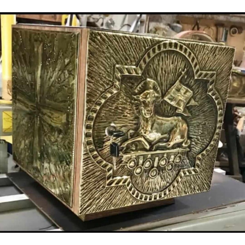 Sacrário feito de madeira. Trabalho manual forrado em metal. Na porta a figura do Cordeiro de Deus em alto relevo dourado. Na parte lateral e superior decorado com cruzes e ornamentos em relevo.