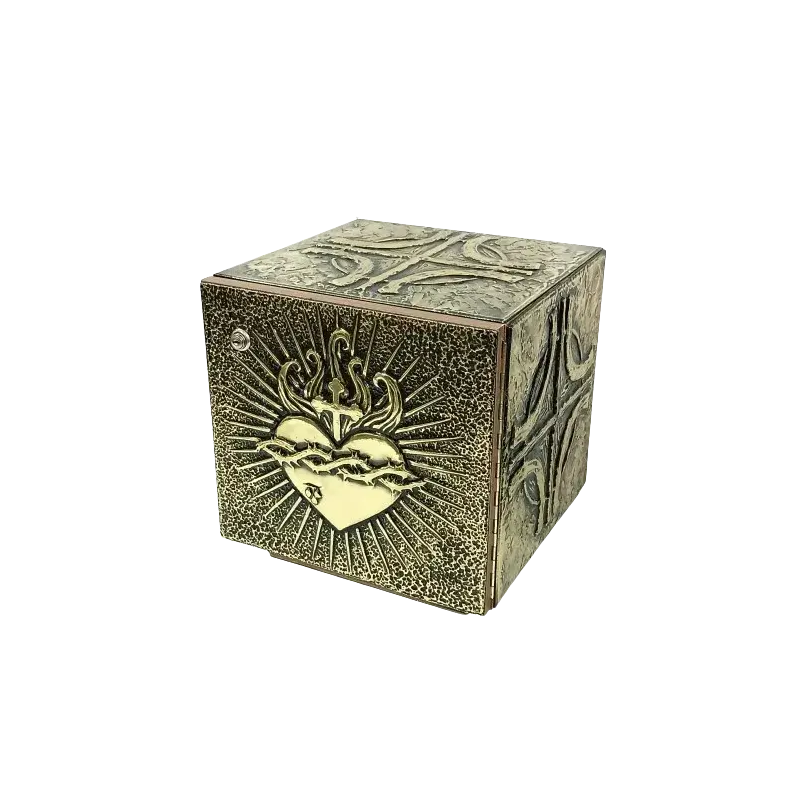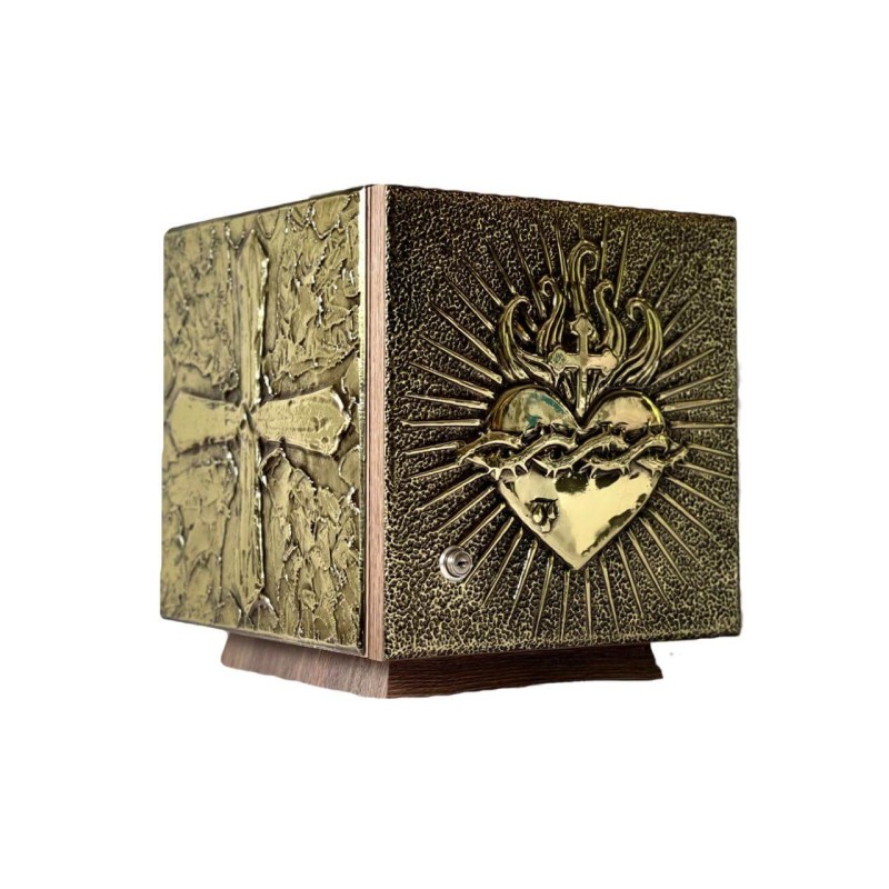 Sacrário feito de madeira. Trabalho manual forrado em metal. Na porta a figura do Sagrado Coração em alto relevo dourado. Na parte lateral e superior decorado com cruzes e ornamentos em relevo.