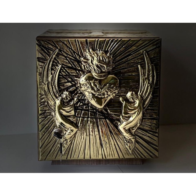 Sacrário feito de madeira. Trabalho manual forrado em metal. Na porta a figura de Anjos com Sagrado Coração em alto relevo dourado. Na parte lateral e superior decorado com cruzes e ornamentos em relevo.