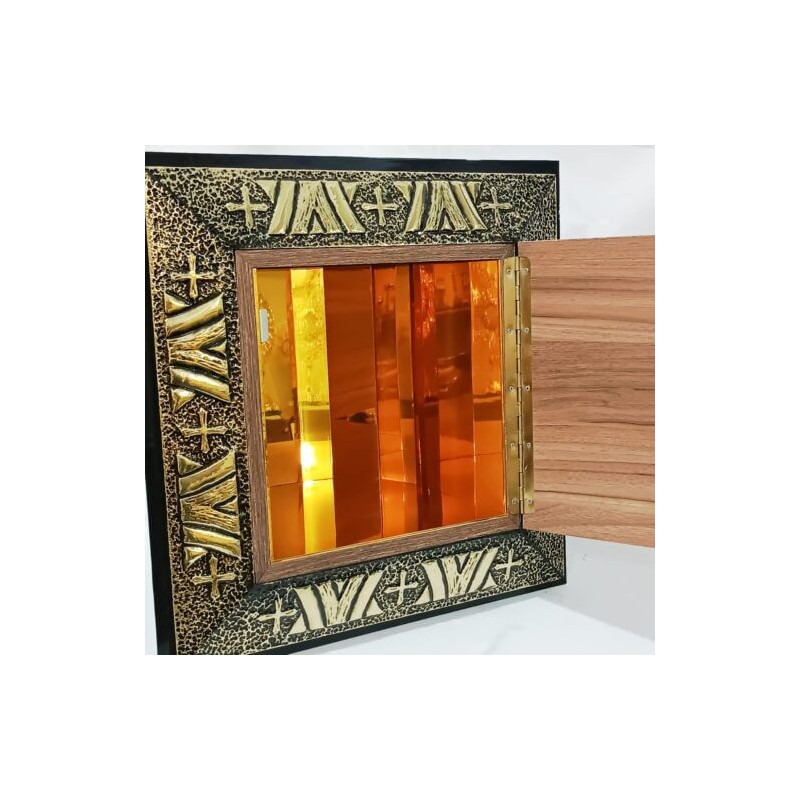 Sacrário de embutir feito de madeira e revestido por dentro e por fora com metal.