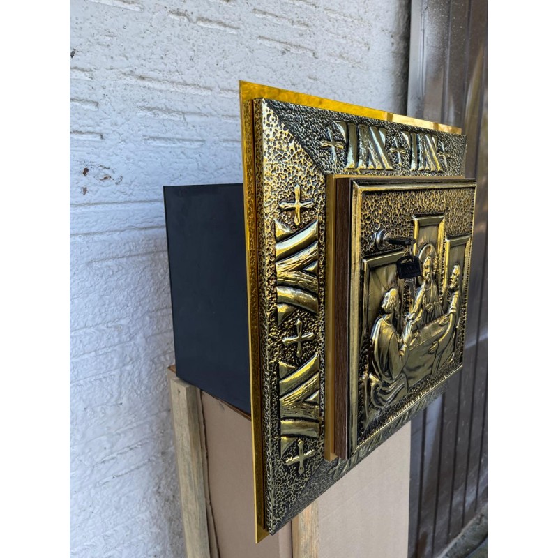 Sacrário de embutir feito de madeira e revestido por dentro e por fora com metal. Na porta, a imagem da Ceia, todos moldados em alto-relevo com riqueza de detalhes.