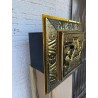 Material: Madeira com revestimento metálico cinzelado artesanalmente. Acabamento interno e externo em metal.