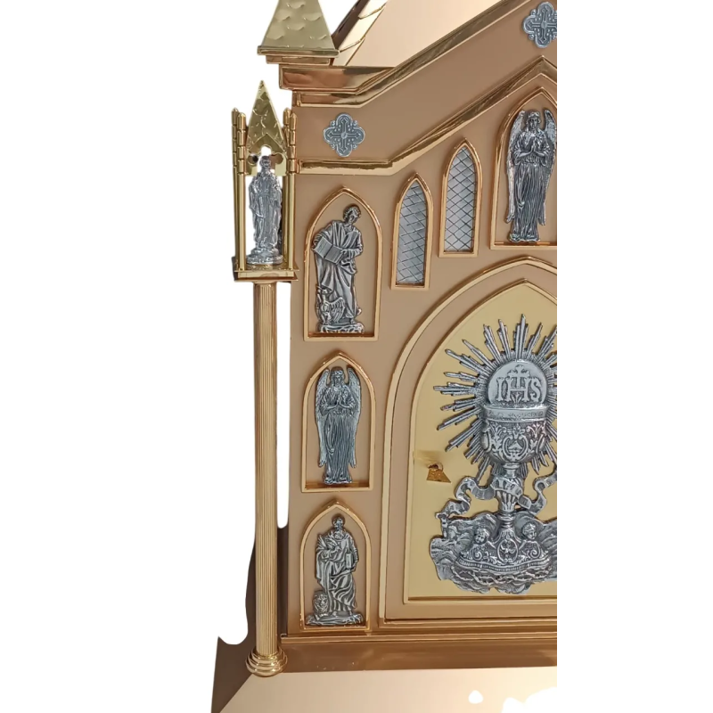 Sacrário confeccionado em metal de alta qualidade, com acabamento em banho dourado e aplicações prateadas em relevo.