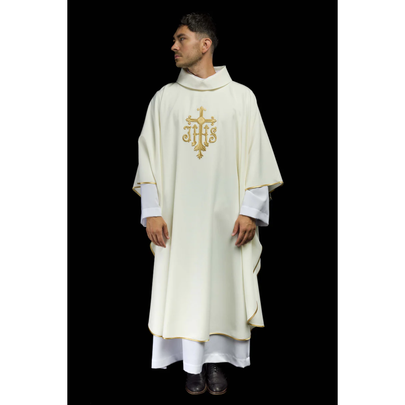 Casula gótica com bordado na frente e atrás e acabamento em cetim.
