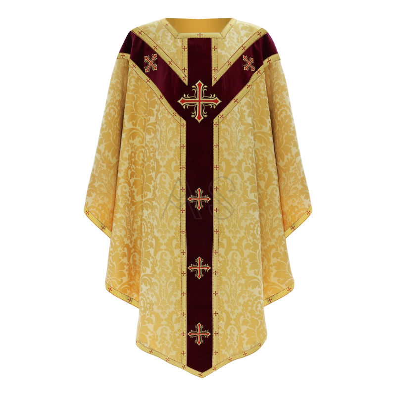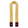 O bordado na frente e atrás com cruzes feitas com linha dourada sobre o tecido de veludo.