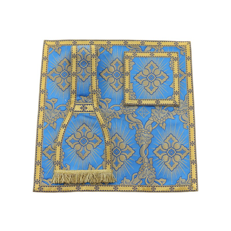 Acompanha uma estola, manípulo, bolsa corporal e véu de cálice.