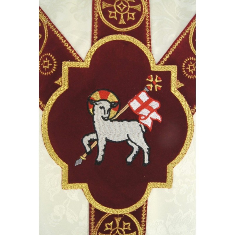 Na parte da frente e atrás tem o bordado em alto relevo com a imagem do Cordeiro de Deus.