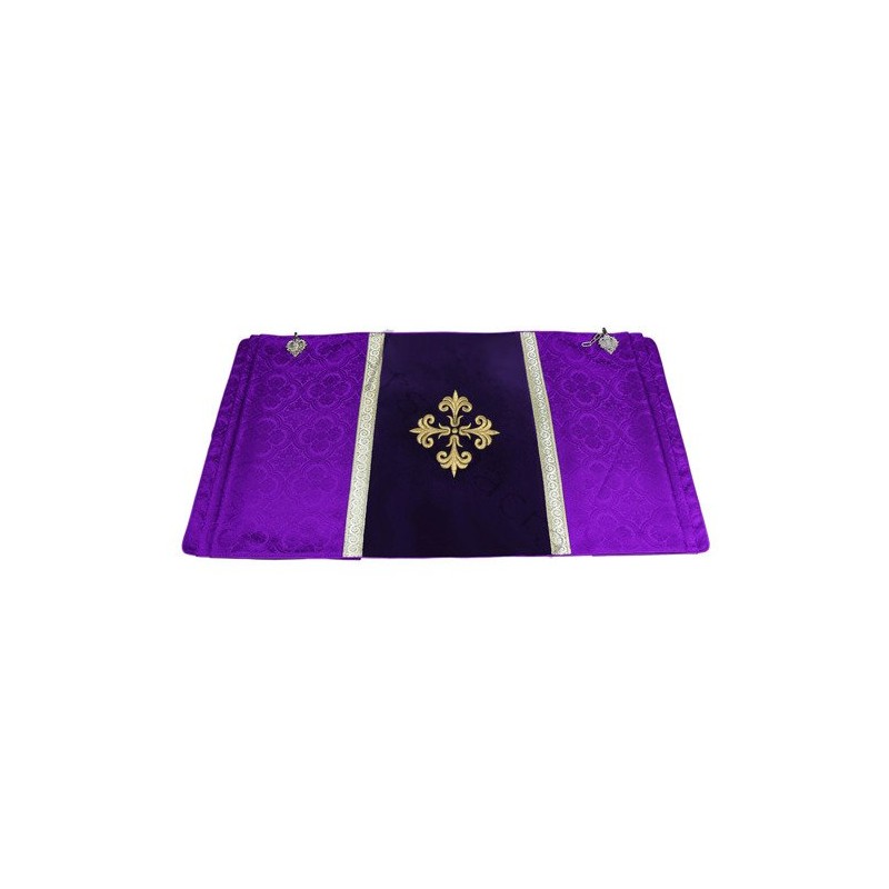 Vía umeral bordado en alto relevo con línea dorada sobre tejido de veludo de alta calidad.