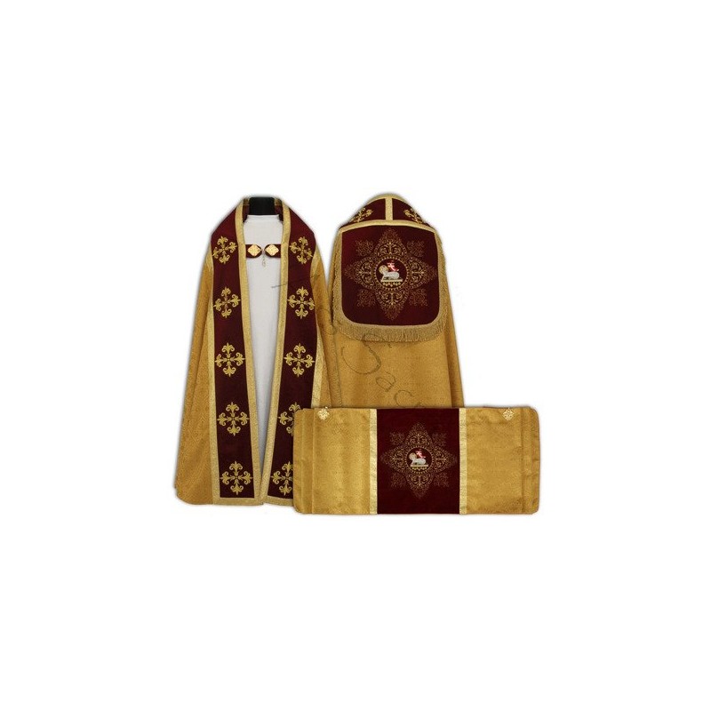 Capa de asperge romana bordada en alto relevo con línea dorada.