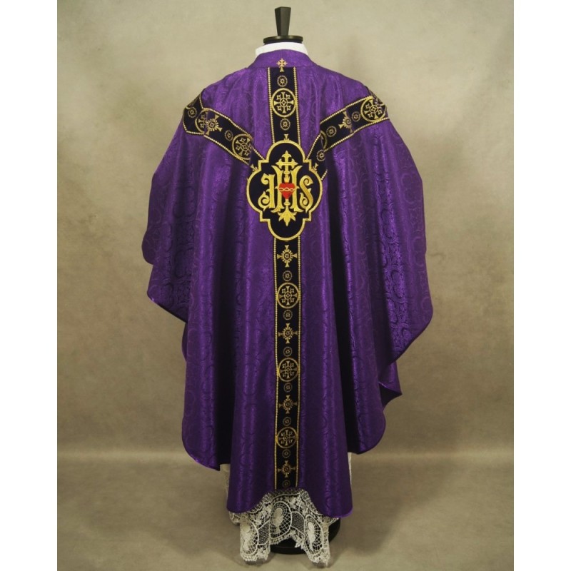Casula semigótica bordada em alto relevo com listra de tecido em veludo e com fios metalizados de altíssima qualidade.