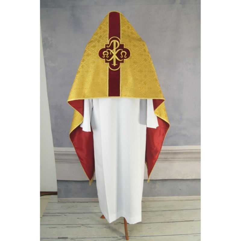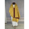 El bordado hecho de cuerpos metalizados dorados es sobre tejido de veludo.