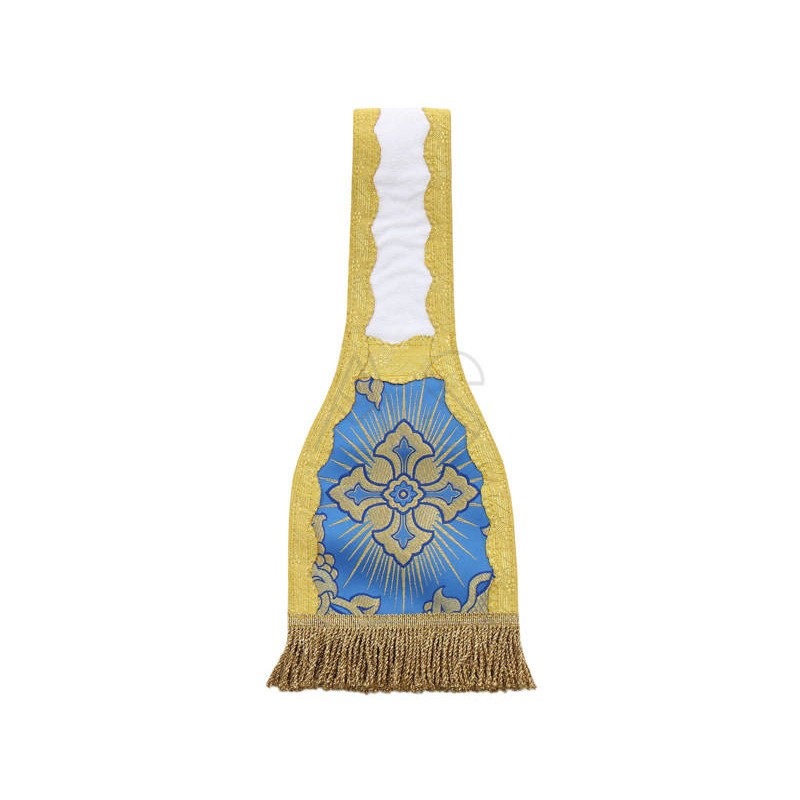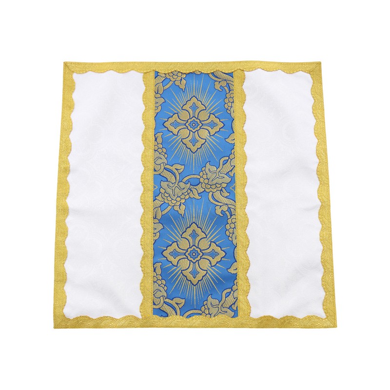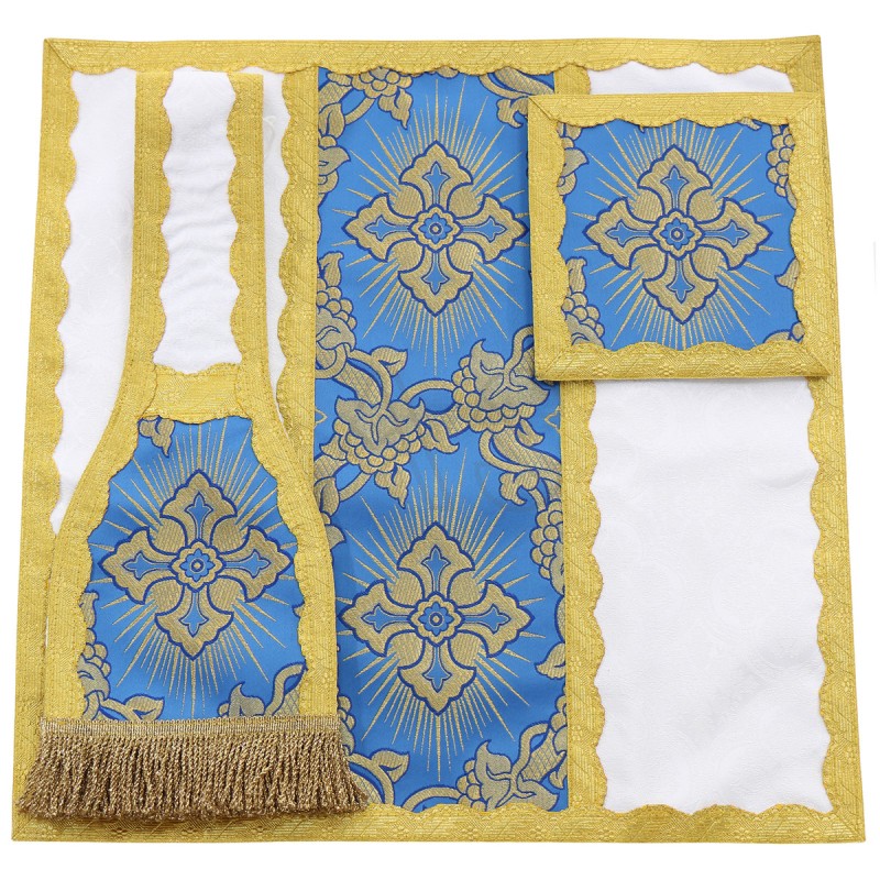 O conjunto inclui: bolsa corporal, manipulo e véu para cálice.