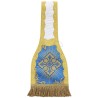 O galão é confeccionado com tecido de seda e acabamentos com fios dourados.