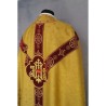 A frente e atrás tem o bordado com as letras JHS e o Sagrado Coração de Jesus sobre o tecido de veludo.