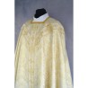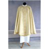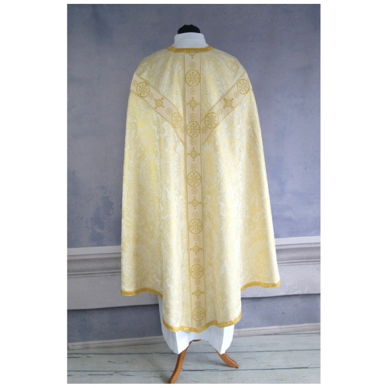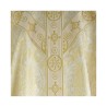 La frente y la parte trasera están decorados con listra de veludo y cinta metalizada dorada.