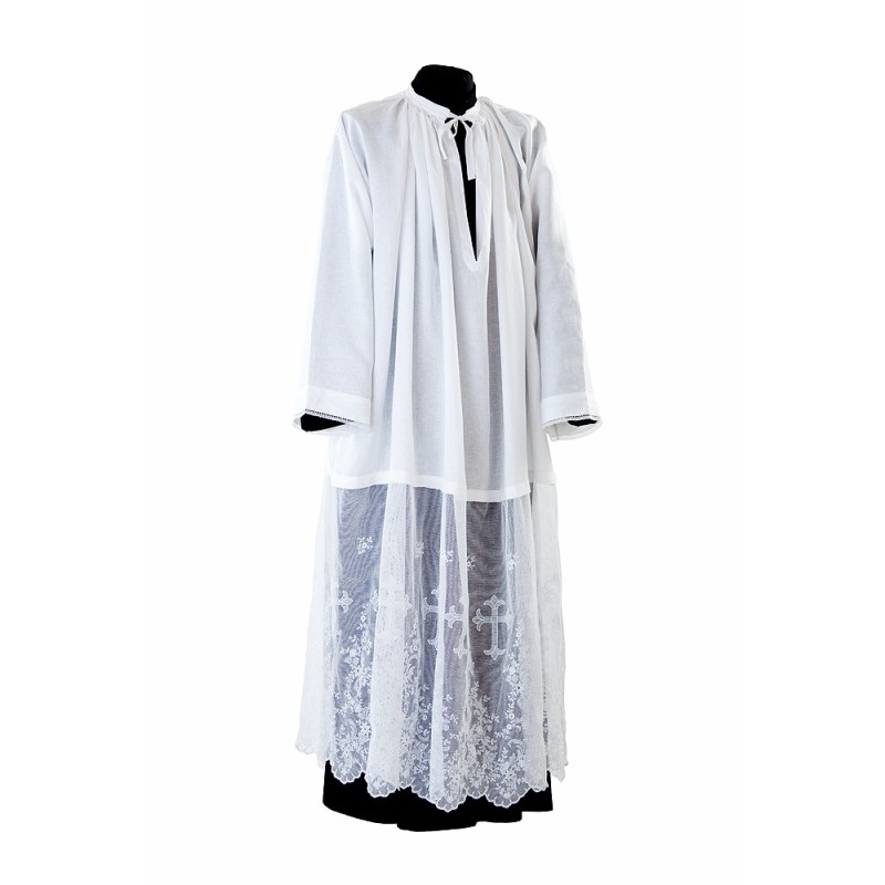 Túnica/Alva de linho natural com renda litúrgica em tule de altíssima qualidade.