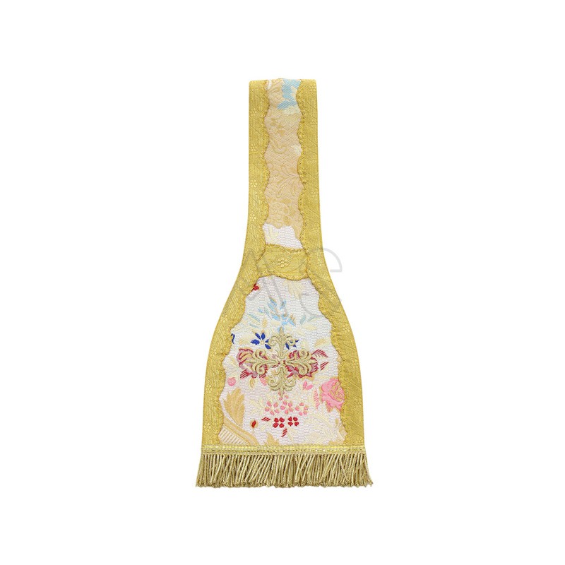 Esta magnífica casula romana acompaña una estola, manípulo, bolsa corporal y véu de cálice.