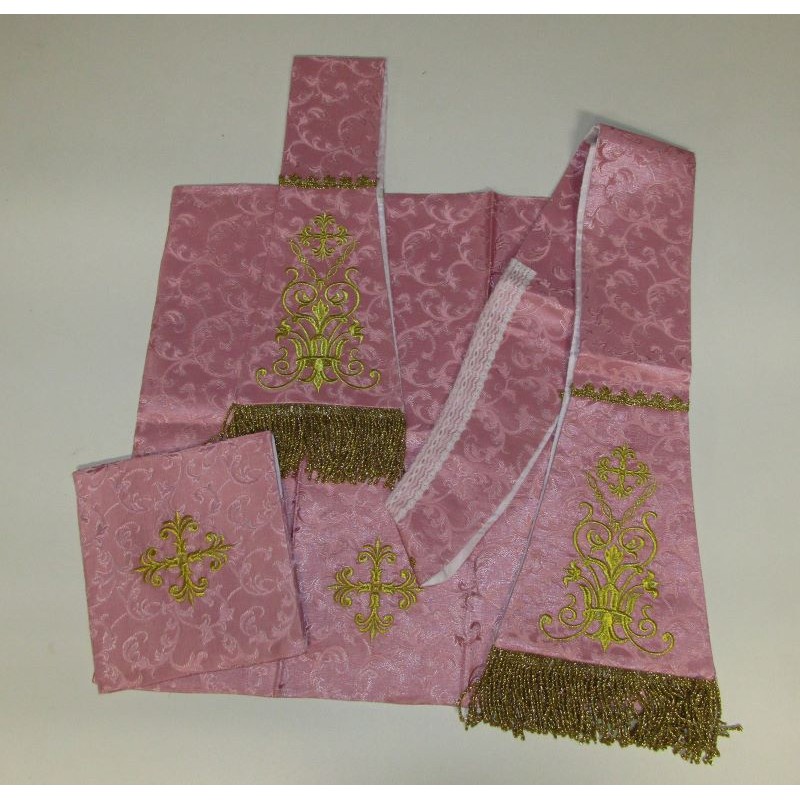 Acompanha uma estola, manípulo, véu de cálice e bolsa corporal.