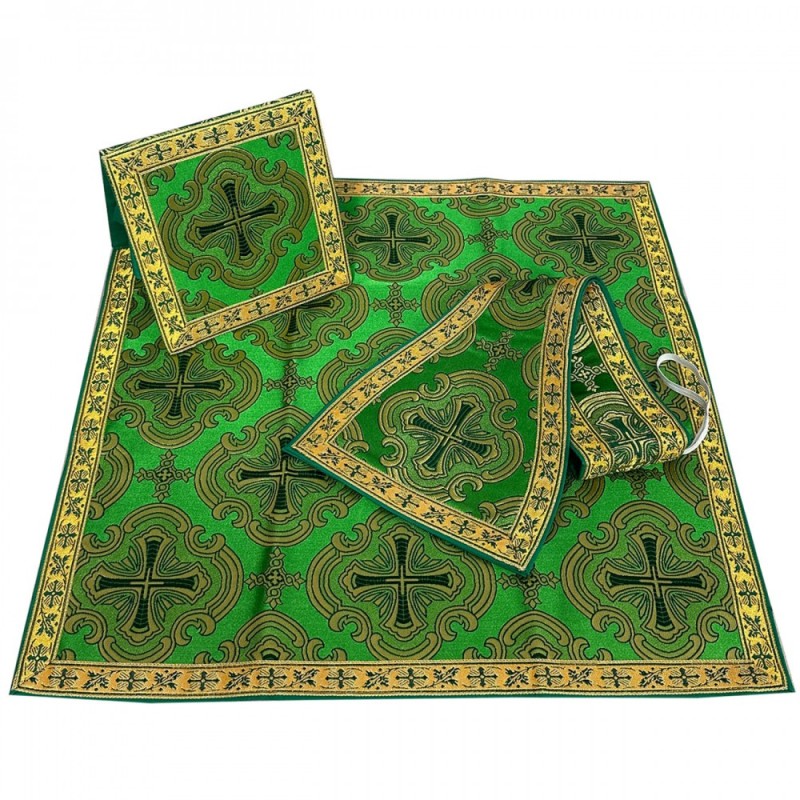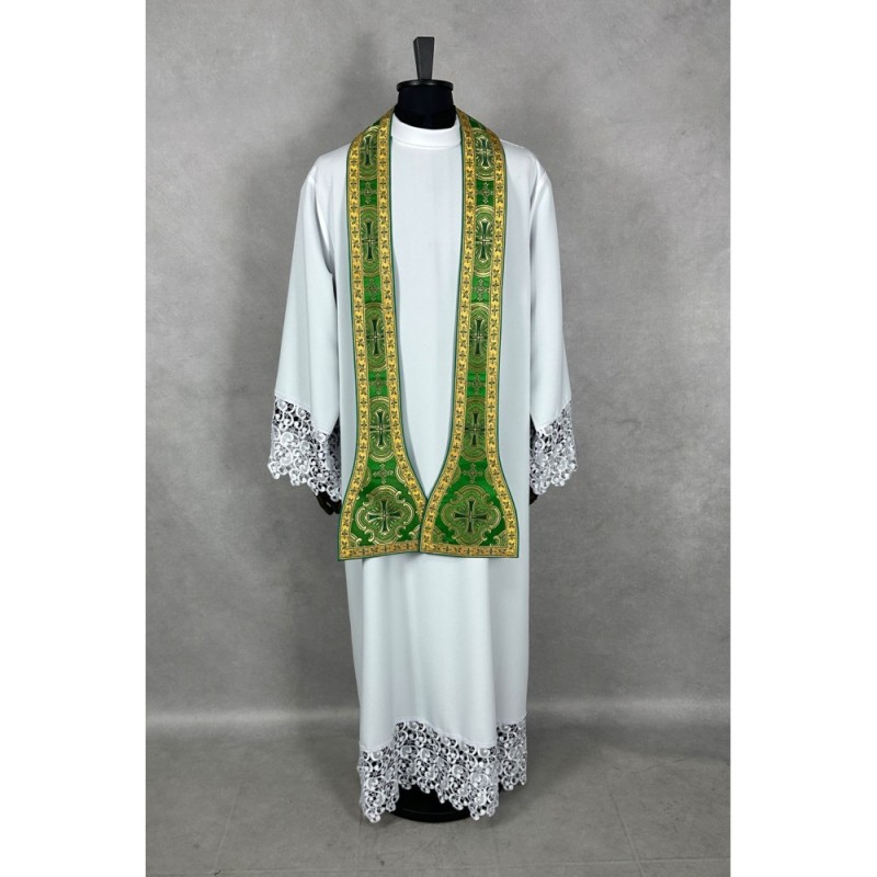 Acompanha uma estola, manipulo, bolsa corporal e véu de cálice.