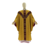 O bordado na frente e atrás com cruzes feitas com linha dourada sobre o tecido de veludo.