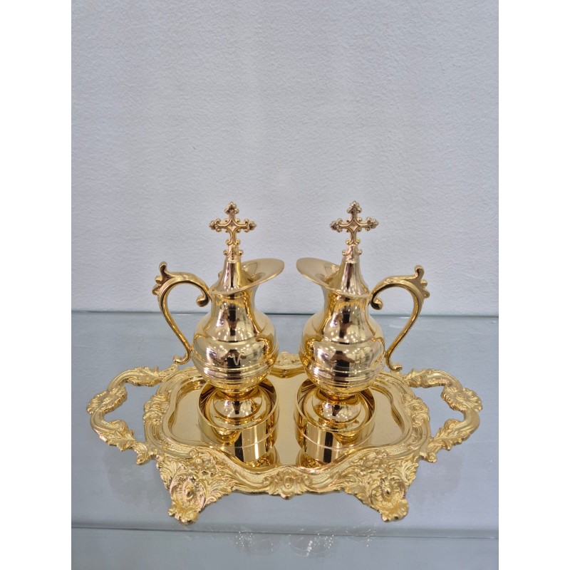 Plato y adornos hechos de latón de color dorado. Las manijas y tapones de las galletas están hechos de metal de color dorado.