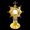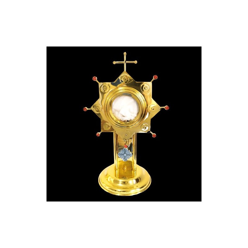 Ostensorio está hecho de bronce, dorado con detalles platados y con una piedra de rubio en la cruz de alta calidad.